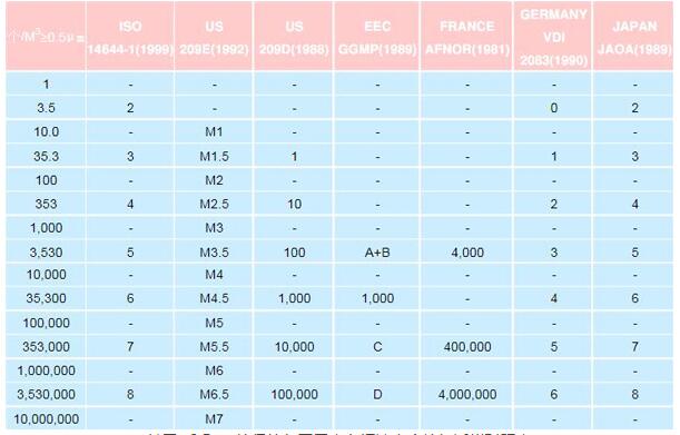 基于≥0.5μm粒徑的各國(guó)無(wú)塵車間潔凈度等級(jí)近似對(duì)照表